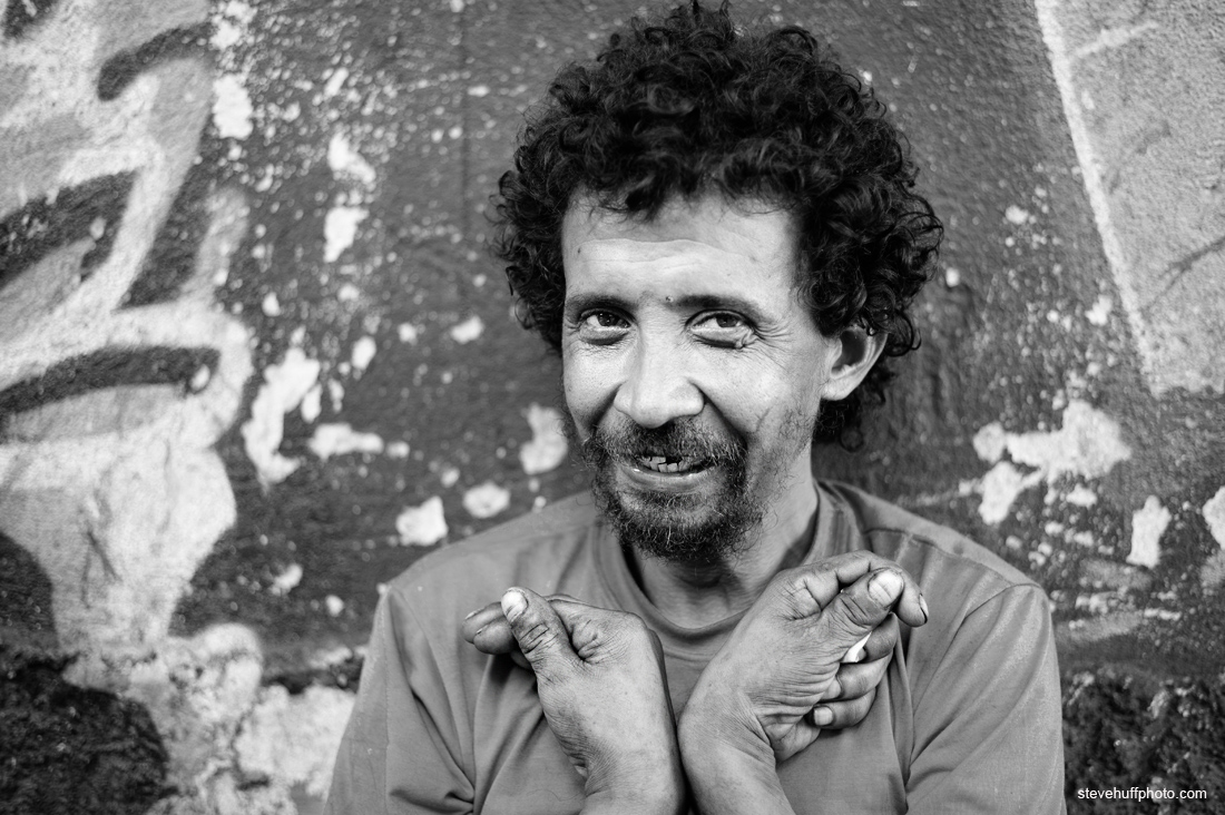 Rio Brazil: Saw this happy smiling man sitting on the street and sat down to chat with him for a while. He did not speak English but he wanted me to take his portrait after he saw my camera, so I did. For me, making a connection to strangers is one of the appeals of taking street portraits.