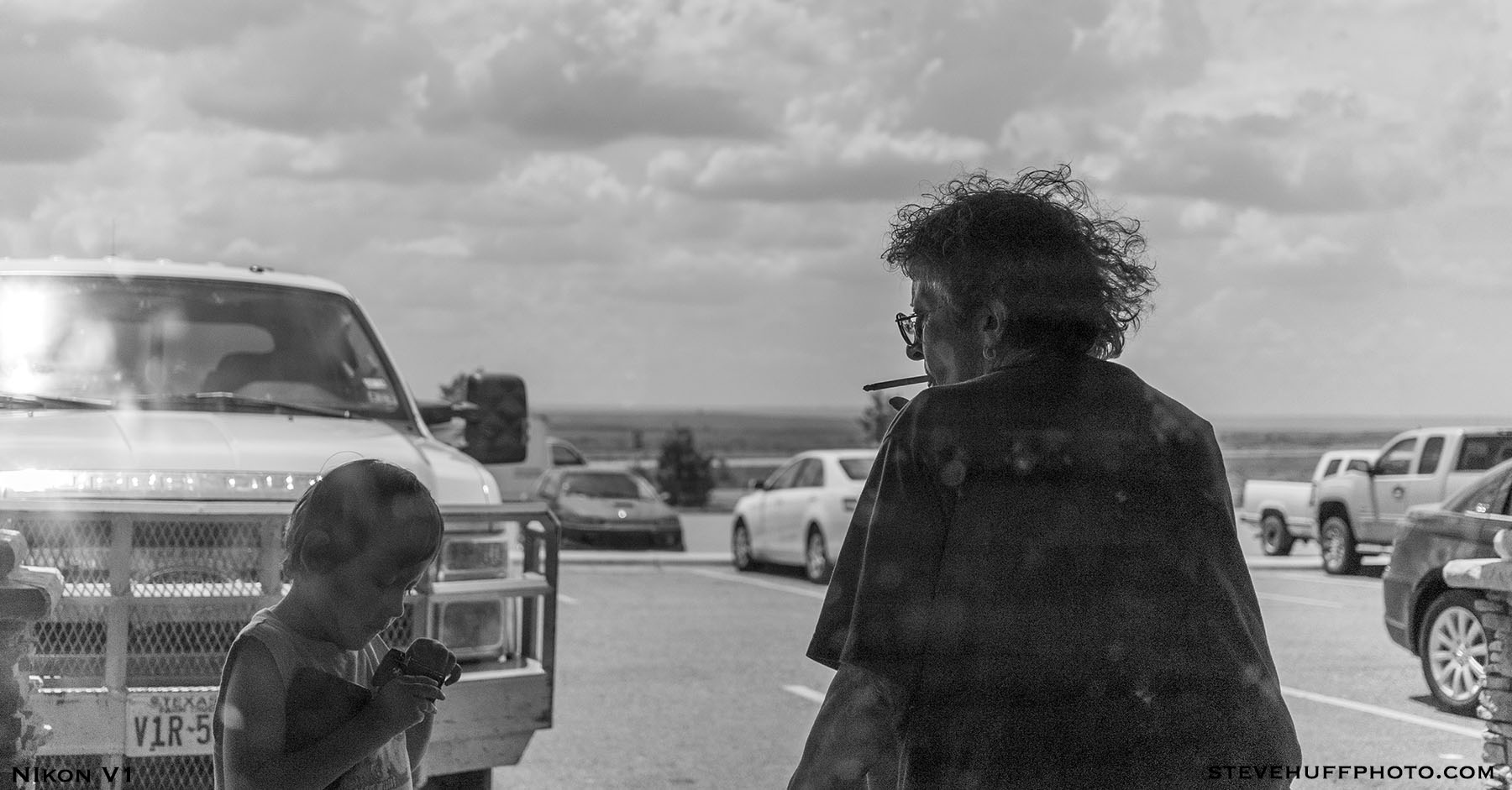 Inside of a truck stop somewhere in middle America: Was eating lunch when I saw a kid outside the window begging his grandmother for money so he could buy a toy he saw inside the shop. She refused at first, telling him NO NO NO! She then relaxed, pulled out a smoke and gave him her coin purse. Seems the cigarette gave her some peace 🙂 I was watching the interaction take place for a while before deciding to snap a shot.