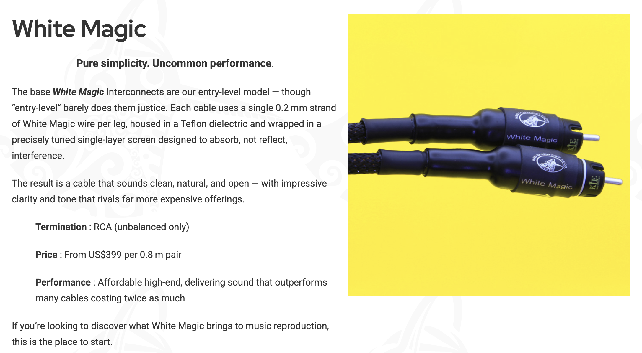 Let me be clear, I much prefer the White Magic interconnects in sound to even the Nordost Valhalla Interconnect which cost $6k when new years ago. A $400 cable bested those for me but I just love the way the White Magic sounds.